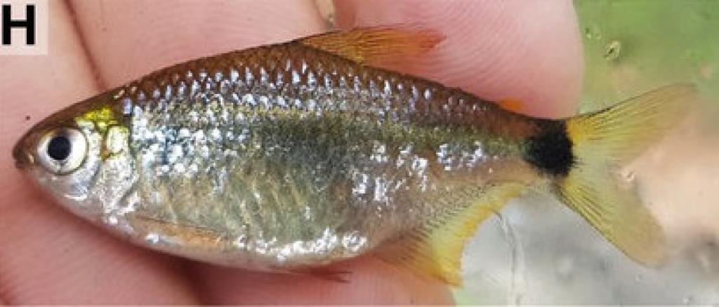 Тело в меру удлиненное с высокой спиной и выдающимся килем. Голова небольшая. Самцы мельче и стройнее самок. Окраска: бока серебристые с зеленоватой полосой. Плавники слабо оранжевые. У основания хвостового плавника черное пятно. Вырастает до 5,1 см SL