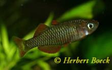 Тело короткое с крупной головой. В спинном плавнике 3 колючих и 9 мягких лучей, в анальном 12 мягких (колючих нет). Самцы ярче окрашены. Окраска: общий фон охристый. Каждая чешуйка в ромбовидной окантовке, что придает сетчатый рисунок. Плавники оранжевые. Вырастает до 2,8 см SL
