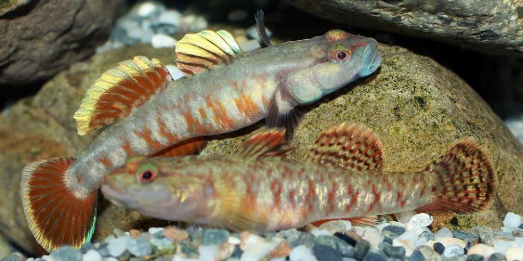 Тело удлиненное, вальковатое с относительно небольшой головой и толстыми губами. В первом спинном плавнике 8 колючих лучей, во втором 8-9 мягких. В анальном плавнике 1 колючий и 8-9 мягких. Окраска: общий фон серо-голубой. От боковой линии к брюху оранжевые полосы. Первый спинной плавник (у самцов) бежевый. Второй красный с желтоватой каймой. Вырастает до 3,6 см SL.