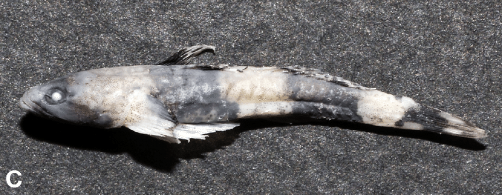 Тело удлиненное с небольшой и плоской головой. В спинных плавниках 7 колючих и 9 мягких лучей, в анальном 1 колючий и 9 мягких. Самцы более головастые. Окраска: голова темная, тело грязно-белое с двумя темными полосами (на корпусе и на хвостовом стебле). Вырастает до 3,4 см SL