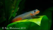 Тело вытянутое в длину с приплюснутое головой. Верхняя челюсть заметно выступает вперед. В первом спинном плавнике 7 колючих лучей, во втором 9-10 мягких лучей. В анальном плавнике 1 колючий и 9-10 мягких лучей. У самцов анальный и спинные плавники крупнее. Повседневная окраска: спина и тело голубые. Иногда в нижней части тела проявляется буро-оранжевая полоса от хвостового плавника до конца второго спинного плавника. Самцы в брачном наряде: нижняя часть головы и от начала второго спинного плавника до хвостового оранжево-бурая. Остальная часть- голубая. вырастает до 5 см (SL).