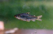 Тело короткое с высокой спиной и небольшой головой. Самцы мельче и стройнее самок. Окраска: общий фон серебристый с темной горизонтальной полосой. В нижней части спинного и хвостового плавников по небольшому черному пятну. Вырастает до 9,3 см SL