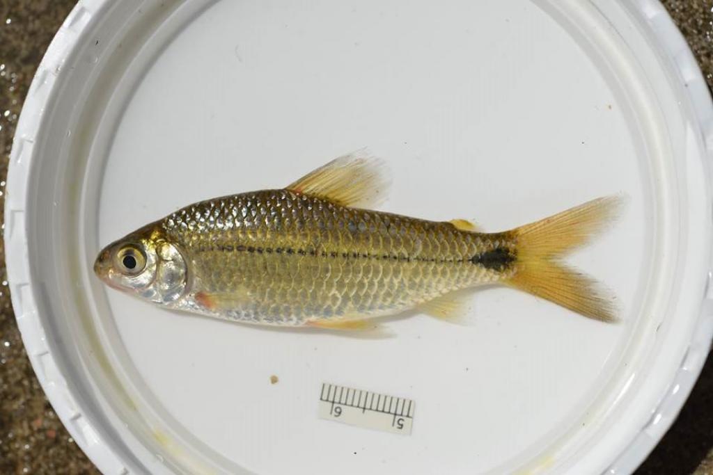 Тело удлиненное с немного высокой спиной и сжатое с боков. Самцы немного мельче и стройнее самок. Окраска: бока золотистые с тонкой черной полосой вдоль боковой линии. У основания хвостового плавника черное треугольное пятно. Плавники желтоватые (во время нереста красные)