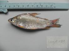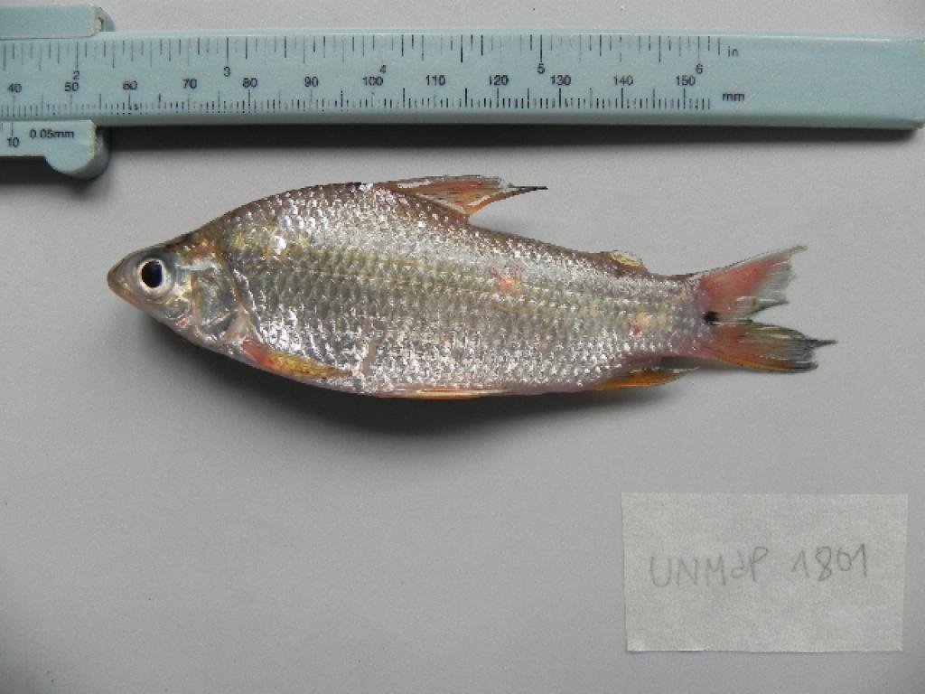 Тело короткое с высокой спиной и маленькой головой. Самцы мельче и стройнее самок. Окраска: общий фон серебристо-серый. Плавники красные. У основания хвостового плавника крошечное черное пятно. Вырастает до 12,8 см SL
