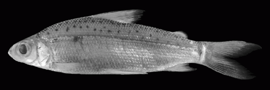 Тело удлиненное с высокой спиной и маленькой головой. Самцы мельче и стройнее самок. Окраска: общий фон серебристо-серый с тонкой темной полосой и пятном в начале корпуса. На спине мелкие пятна. Вырастает до 10,6 см SL