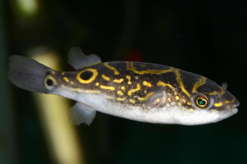Тело короткое, шарообразное с большими навыкате глазами. Половые различия трудно различимы. Половозрелые самки крупнее самцов. Окраска: общий фон темно-коричневый (брюхо белое). На теле множество кривых полос желтого цвета. На спине ломаная желтая линия образует узор в виде восьмерки. На боках (в основном в задней части корпуса) несколько черных пятен, обведенных в желтый кант. Вырастает до 8 см.