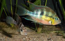 Тело короткое с высокой спиной и крупной головой. Самцы больше самок, ярче окрашены в брачный период и с удлиненными концами спинного и анального плавников. Окраска: бока желто-голубые с темными вертикальными полосами. Вырастает до 15 см SL