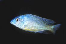 Тело короткое с высокой спиной и крупной головой. Самки серебристо-серые, самцы голубые с оранжевым вкраплениями на боках. Вырастает до 16 см TL