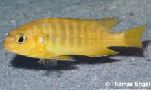 Тело удлиненное с небольшой головой округлой формы. Самки желтые с темными полосами, самцы синиe с почти черными вертикальными полосами. Вырастает до 6,3 см SL