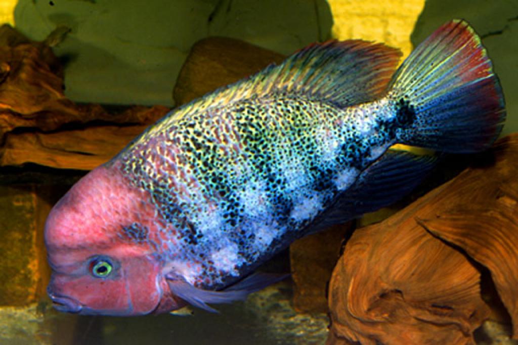 Тело короткое с большой головой. Самцы крупнее самок, с удлиненными концами спинного и анального плавников и в брачный период у них на голове вырастает жировая шишка. Окраска: голова розовая, тело голубовато-белое с 6-ю темными вертикальными полосами. Вырастает до 25 см SL